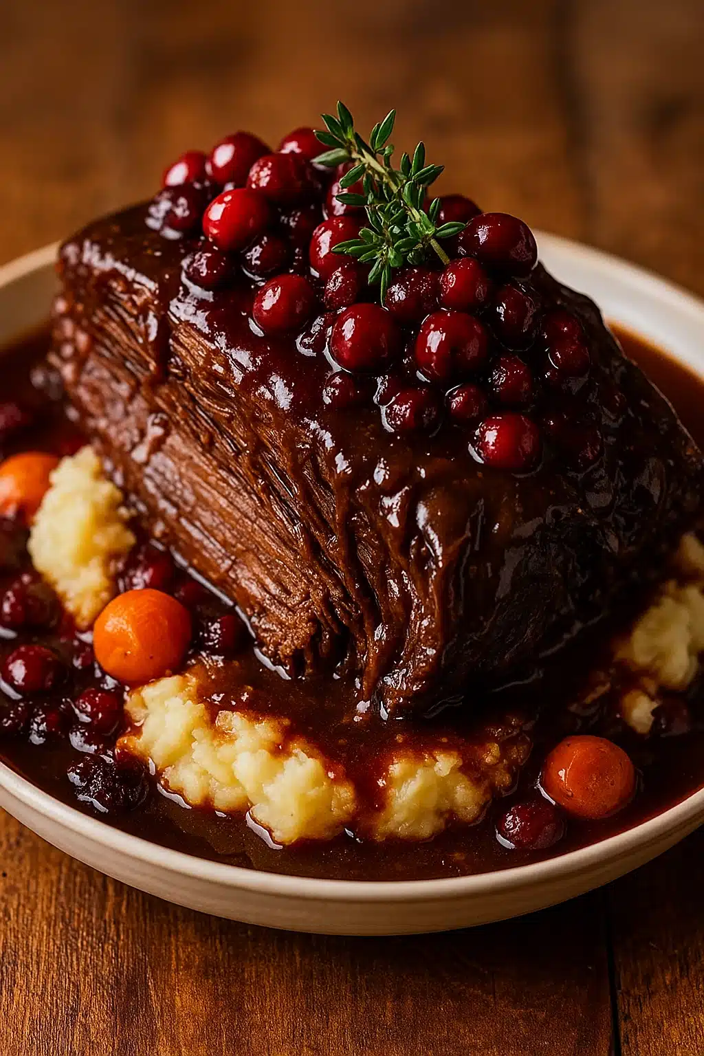 Rich, tender beef slow-braised with cranberries, balsamic vinegar, and thyme — a festive, hearty centerpiece for any Christmas dinner.