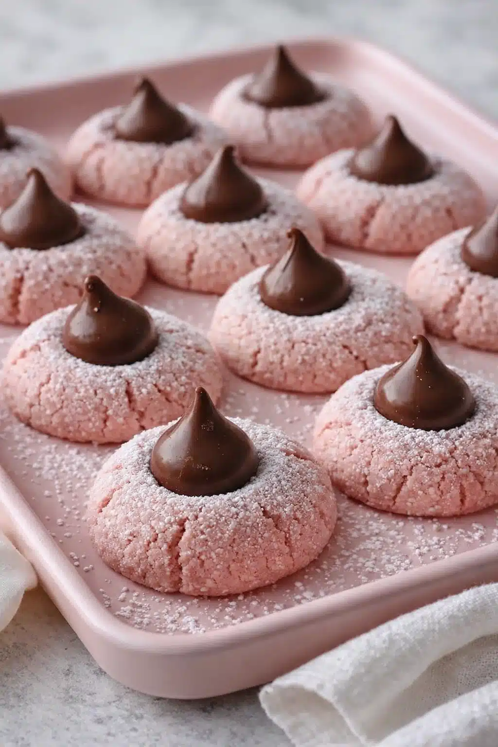 Soft pink cherry cookies topped with chocolate kisses on a pastel tray a sweet Valentine’s Day delight.