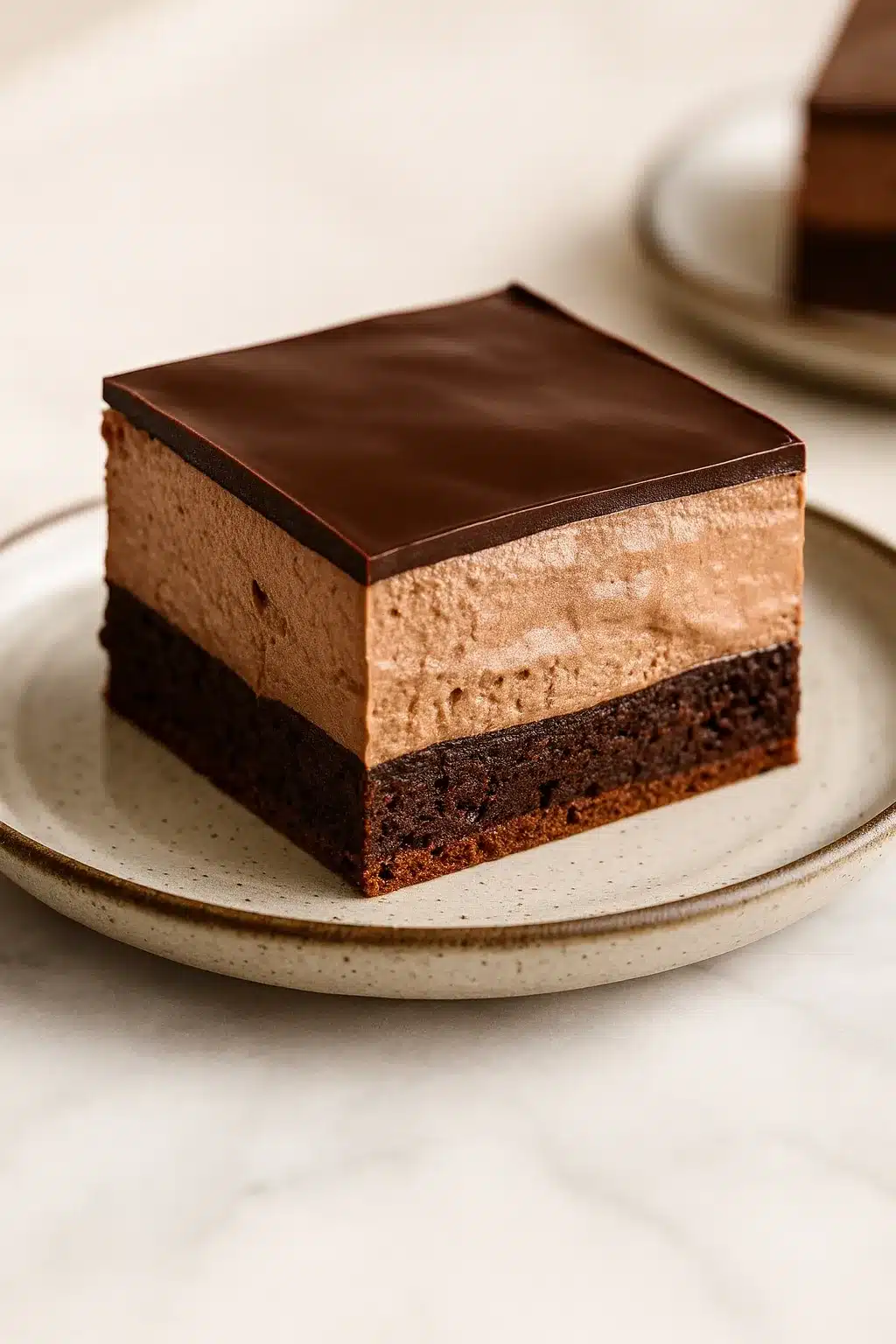 Cool each layer completely before adding the next to prevent melting. Fold the mousse gently to keep its airy texture. Always use high-quality chocolate it truly makes a difference. For clean edges, wipe your knife after every cut. Store covered in the fridge for up to 4 days, and the flavor actually deepens over time.