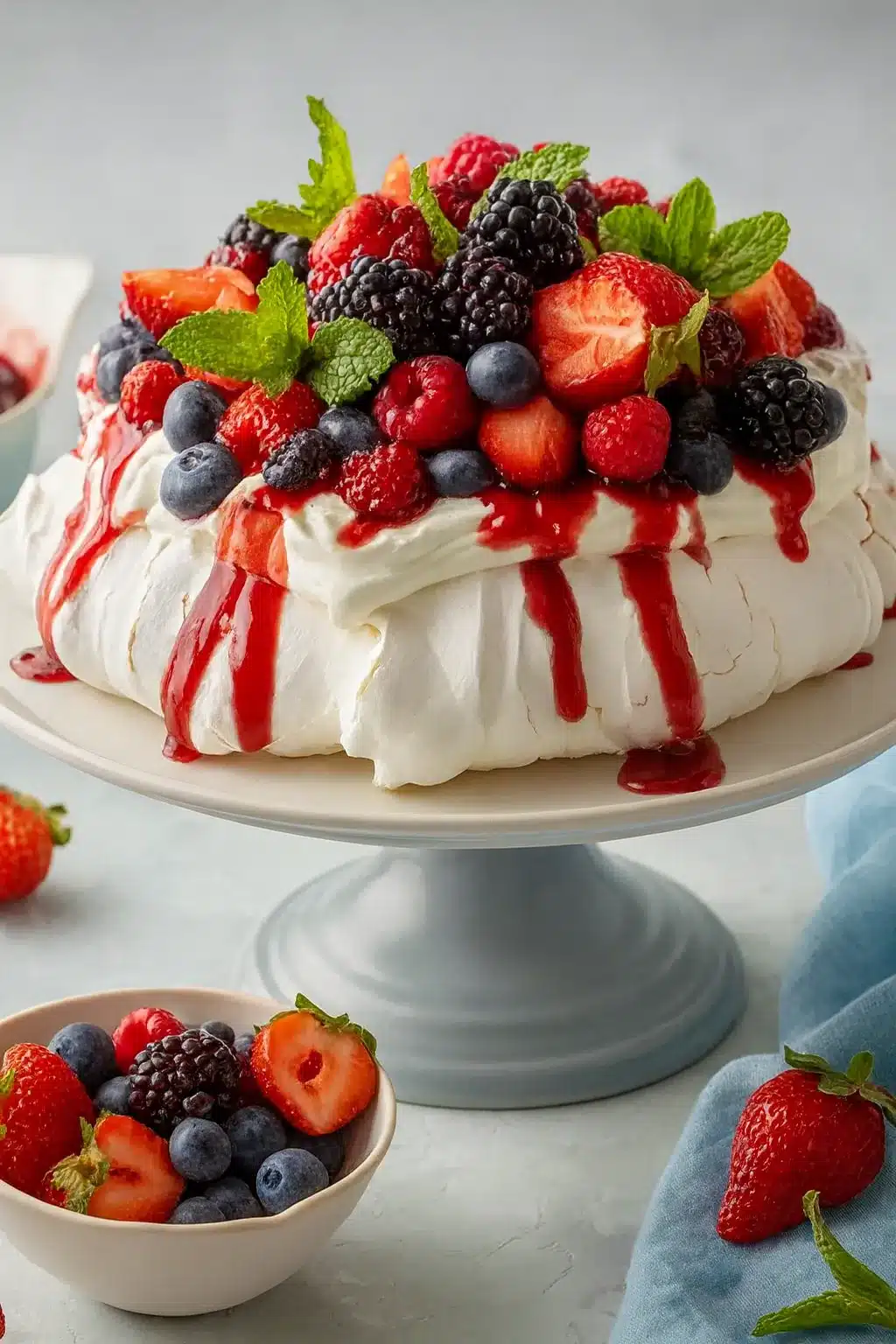 Classic Christmas pavlova topped with fresh berries, mint, and cream for a stunning holiday dessert