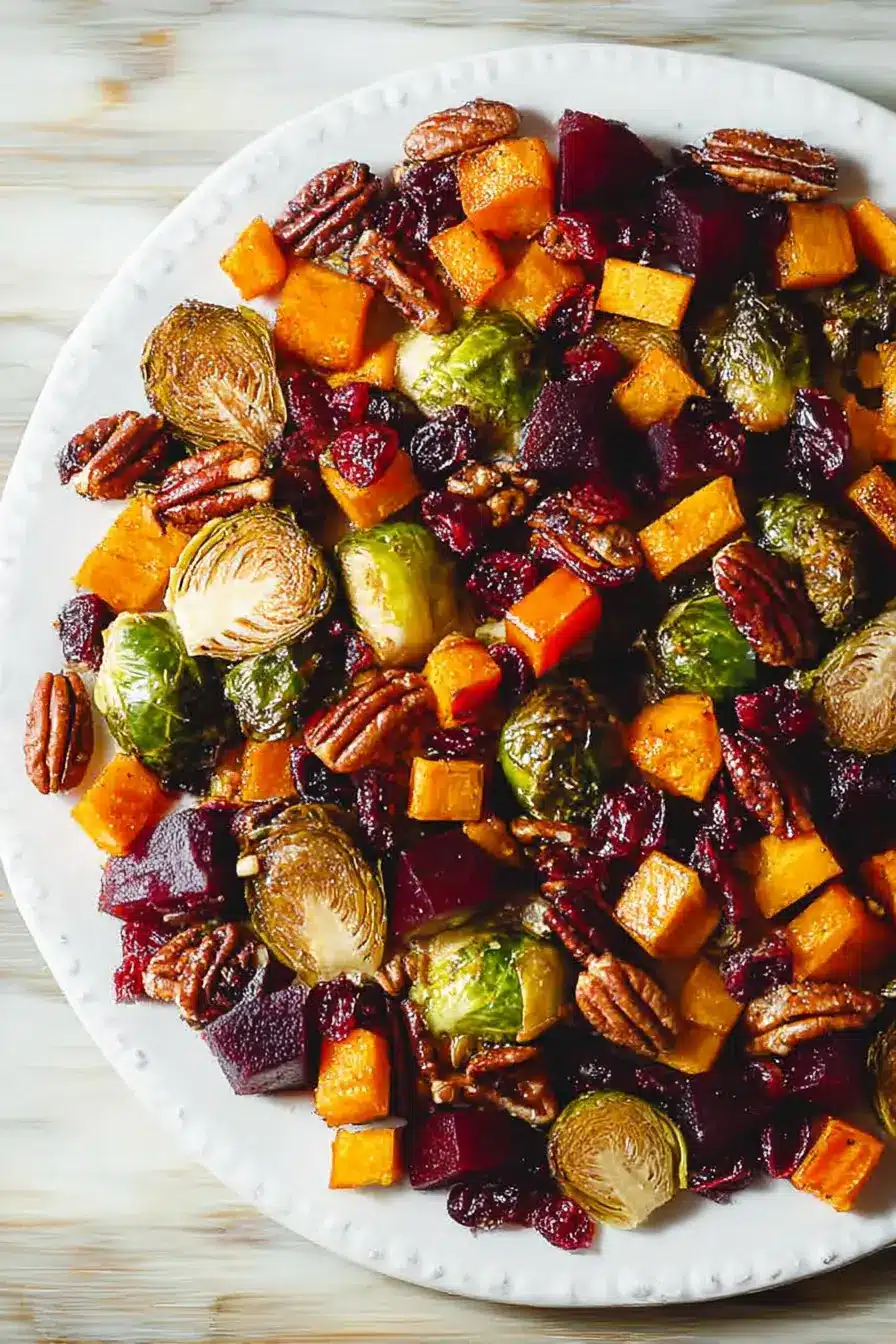 This vegetable salad is a simple, colorful, and nourishing centerpiece for any Christmas table. Its mix of roasted Brussels sprouts, butternut squash, and beets gives it depth, while pecans and cranberries add crunch and sweetness. Whether served warm or cool, it’s proof that festive food can be both wholesome and beautiful. For more inspiration, follow along on Pinterest or join our cooking family on Facebook.