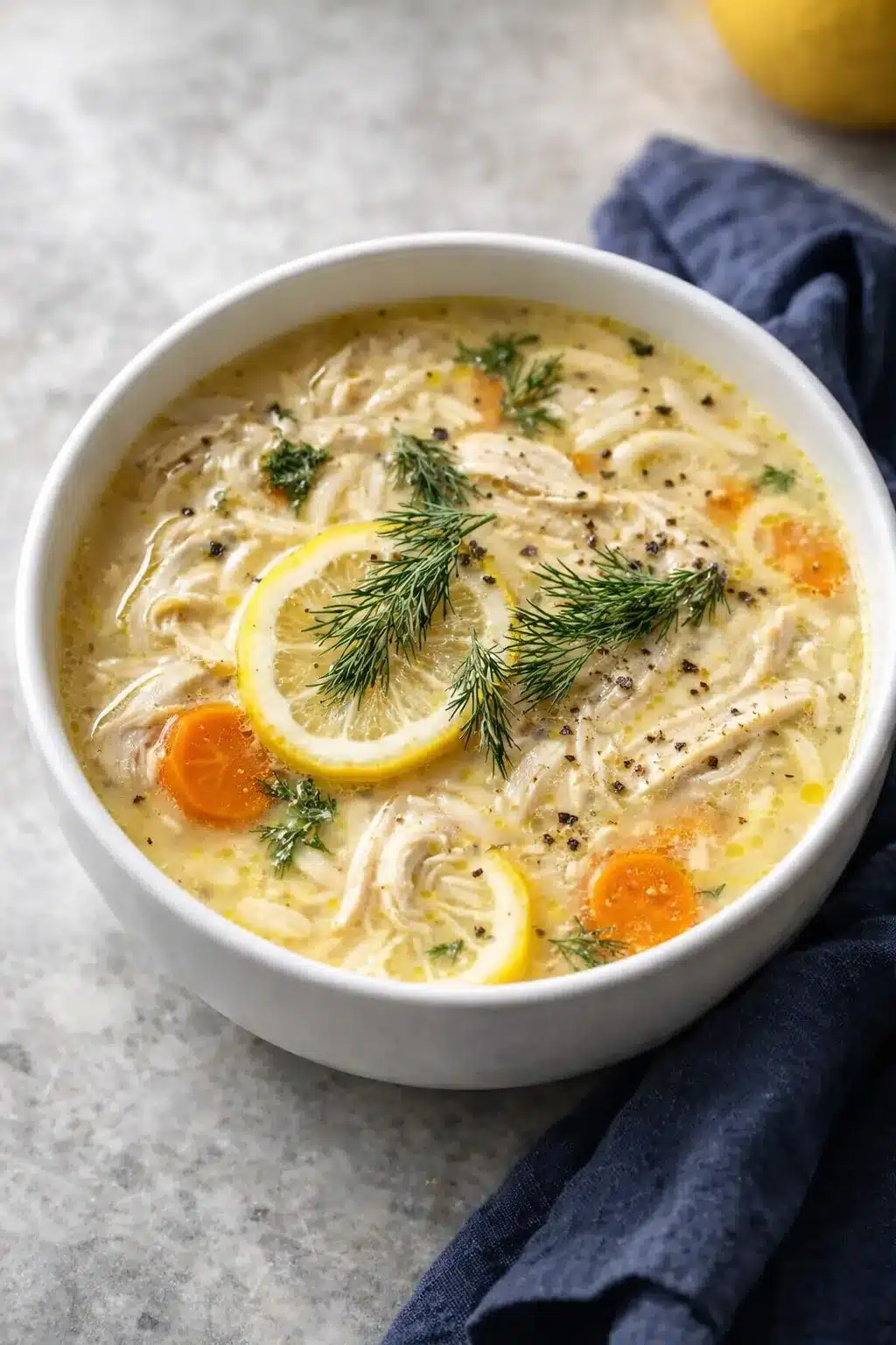 Creamy Greek lemon chicken soup with orzo, lemon slices, dill, and carrots in a white bowl