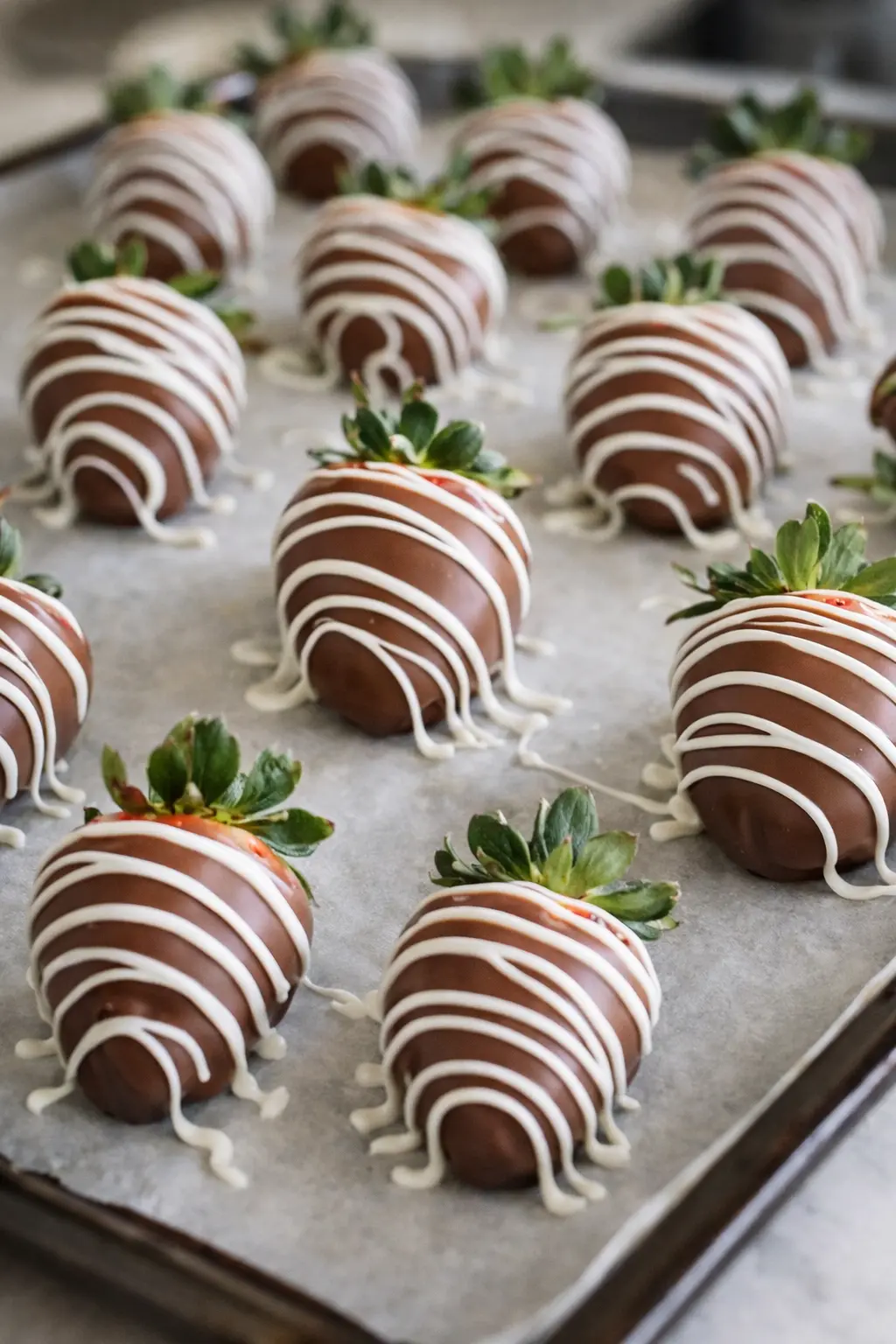 Use 24 medium strawberries, washed and completely dry. Any moisture can ruin the chocolate coating, so pat them well and let them air dry fully. Room-temperature strawberries give you the smoothest chocolate finish.