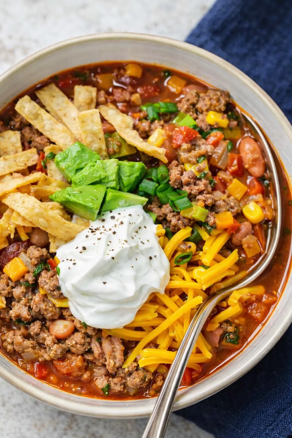 Taco soup has a brothier base and bolder taco flavor. Chili tends to be thicker and deeper in spice. Both are comforting, but taco soup tastes lighter and more playful.