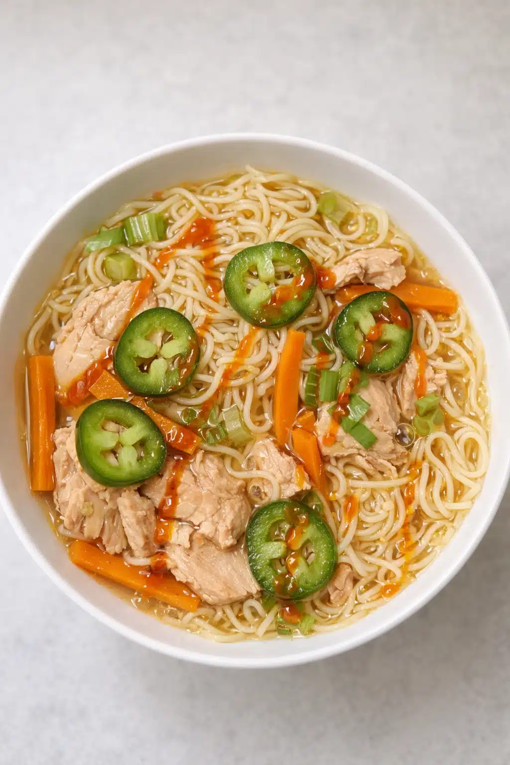Return shredded chicken to the pot. Warm for a minute, taste, and add more soy sauce or salt if needed. Finally, ladle into bowls and top with scallion greens and a drizzle of sauce.