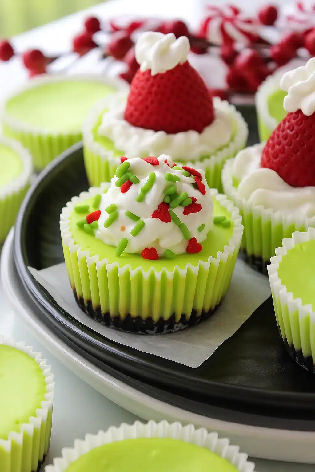 Christmas cheesecake is a rich, creamy dessert often decorated or flavored for the holidays like these green Grinch minis that bring a touch of whimsy to your table.