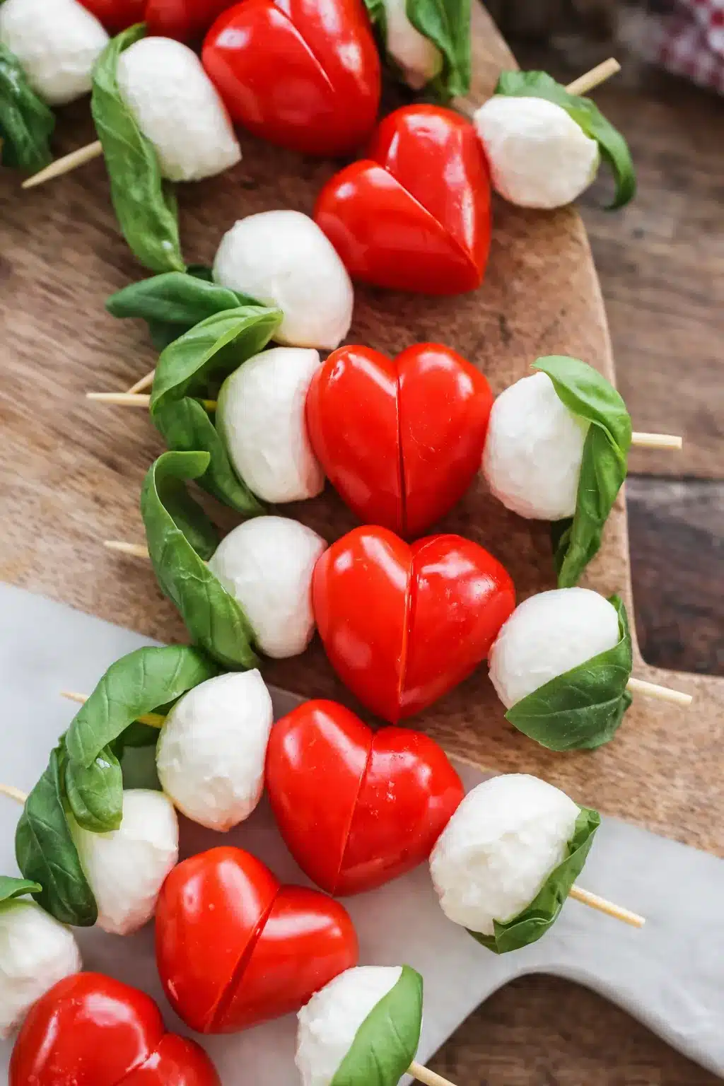Heart-shaped tomato Caprese skewers with mozzarella and basil on a wooden board