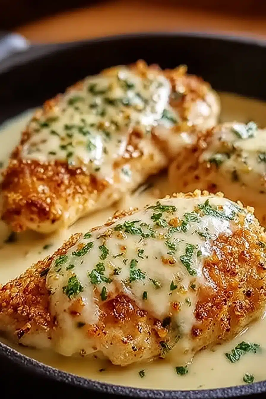 This chicken hits every craving at once. It’s crispy on the outside, juicy inside, and loaded with rich Parmesan and mozzarella that melt into a creamy topping. Every bite delivers that perfect mix of golden crust and savory cheese. It’s restaurant-worthy but simple enough for any night of the week. Whether for a family dinner or a dinner-for-two, it’s pure satisfaction in one baking dish.