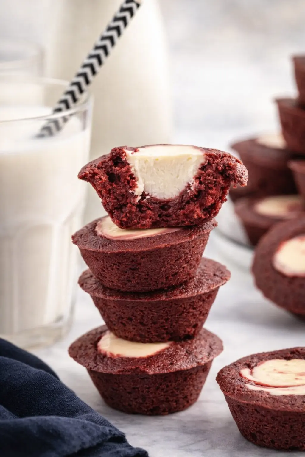 Stacked mini red velvet cheesecakes with creamy, marbled centers beside a glass of milk.