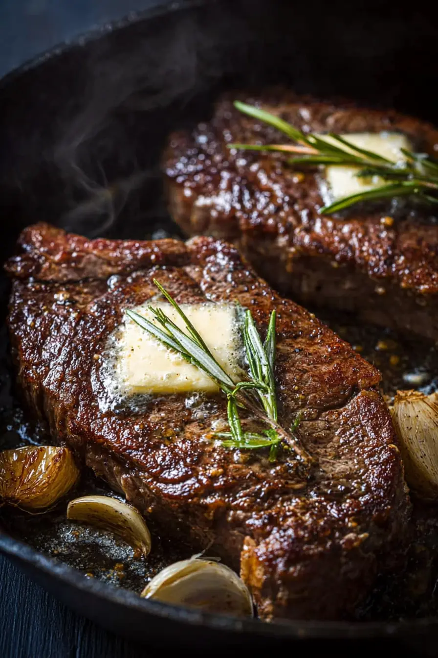 This pan seared steak pairs beautifully with sides that balance its richness. Try garlic herb roasted potatoes, carrots and zucchini or buttery mashed potatoes. You could also serve garlic parmesan grilled corn on the cob for a cozy, rustic touch. Add a simple green salad or roasted Brussels sprouts for color and crunch.