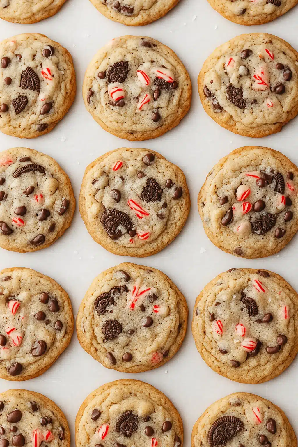 Chewy Peppermint Oreo Cookies filled with crushed Oreos, chocolate chips, and peppermint crunch pieces. Perfect for Christmas gifting or cozy winter nights.