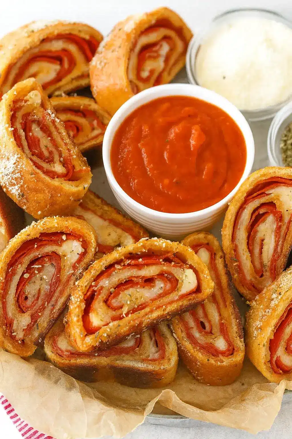 Serve your pepperoni rolls with a warm bowl of marinara sauce for dipping. They pair beautifully with a crisp Caesar salad or tomato soup. These rolls also shine at game-night spreads or as a quick grab-and-go dinner alongside creamy chicken pesto pasta or garlic parmesan chicken dinner.