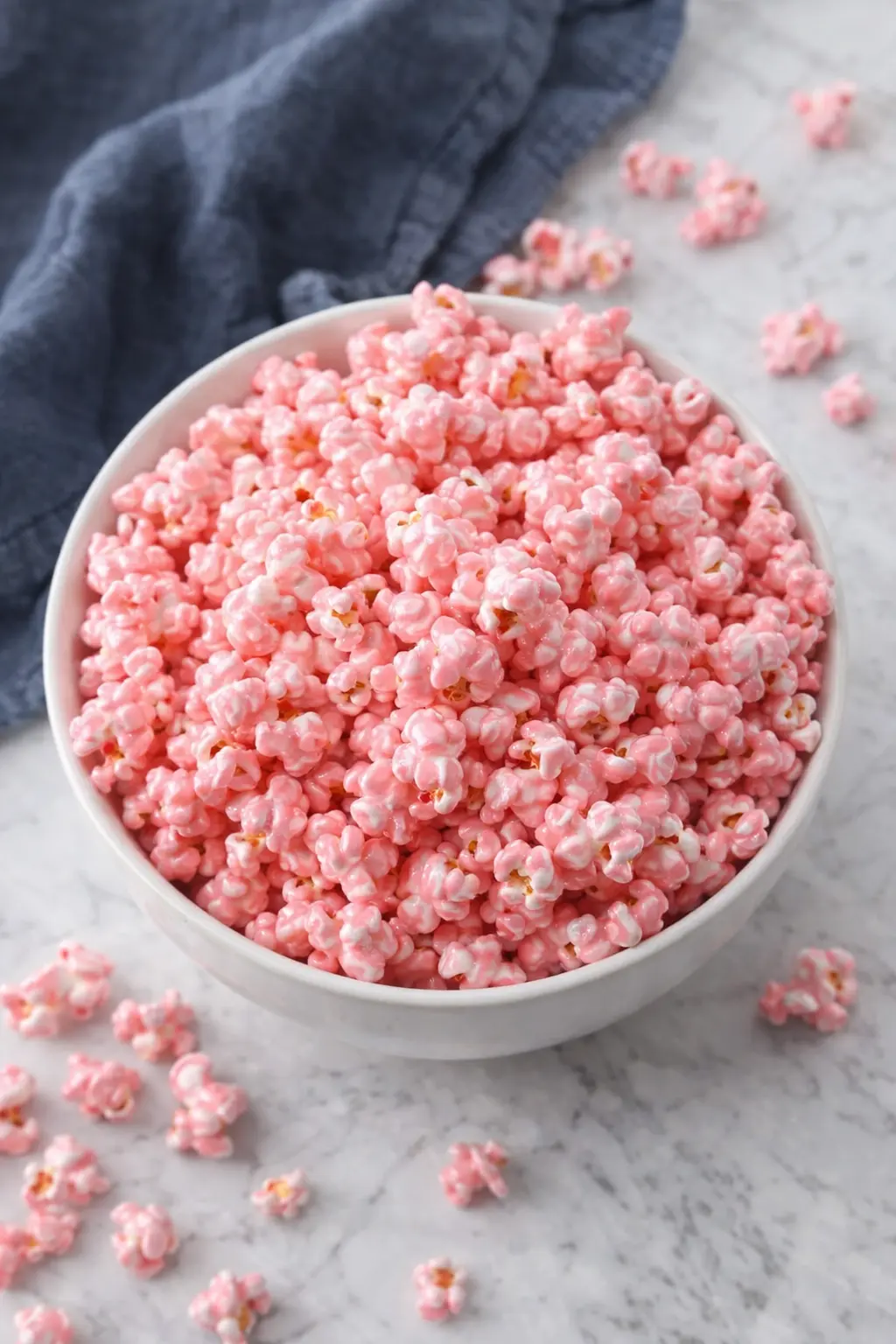 Pink popcorn is candy-coated popcorn made with sugar syrup tinted pink. It’s crunchy, sweet, and often enjoyed during holidays like Valentine’s Day.