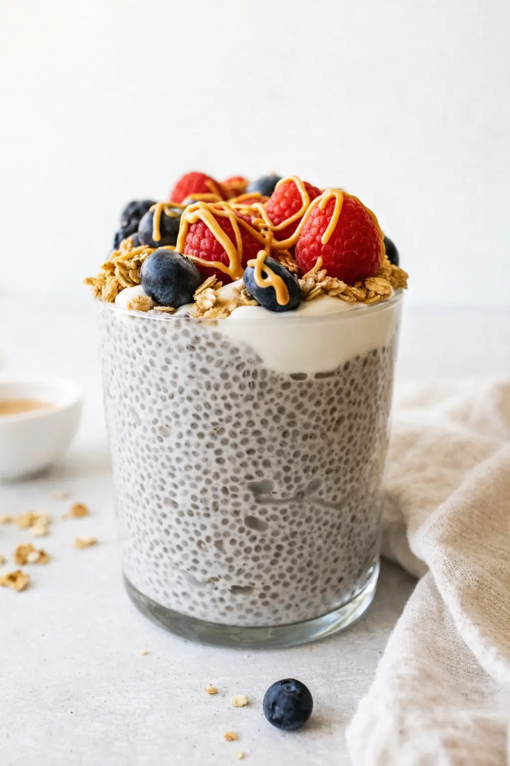 Protein chia pudding topped with granola, peanut butter drizzle, and fresh berries on a white table.