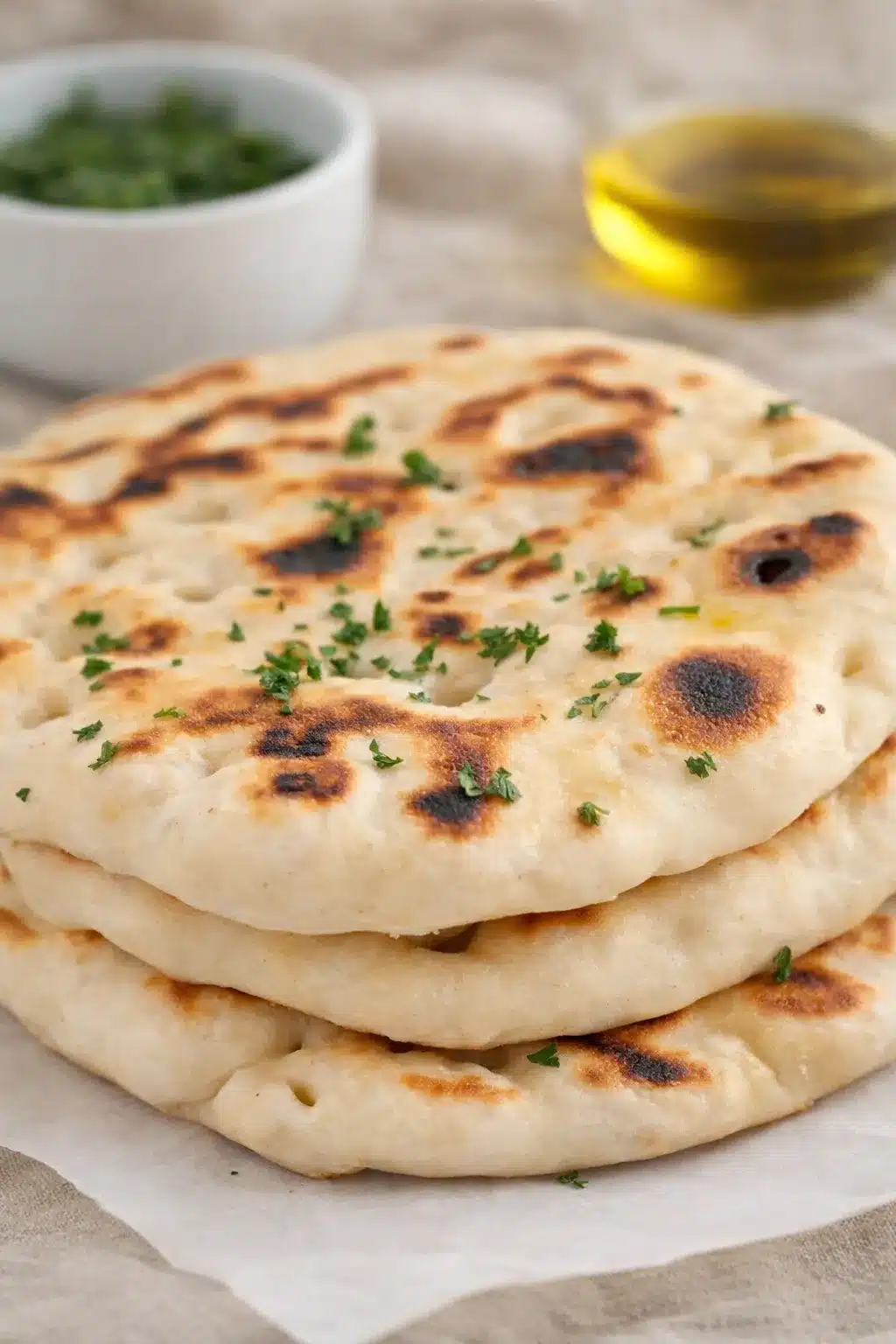 For the full batch, expect around 800–900 calories without added butter. You’ll get 20–25 grams of protein, 20–25 grams of fat, and roughly 120–130 grams of carbs. This version is lighter than traditional naan since it skips yeast and uses just two wholesome ingredients.