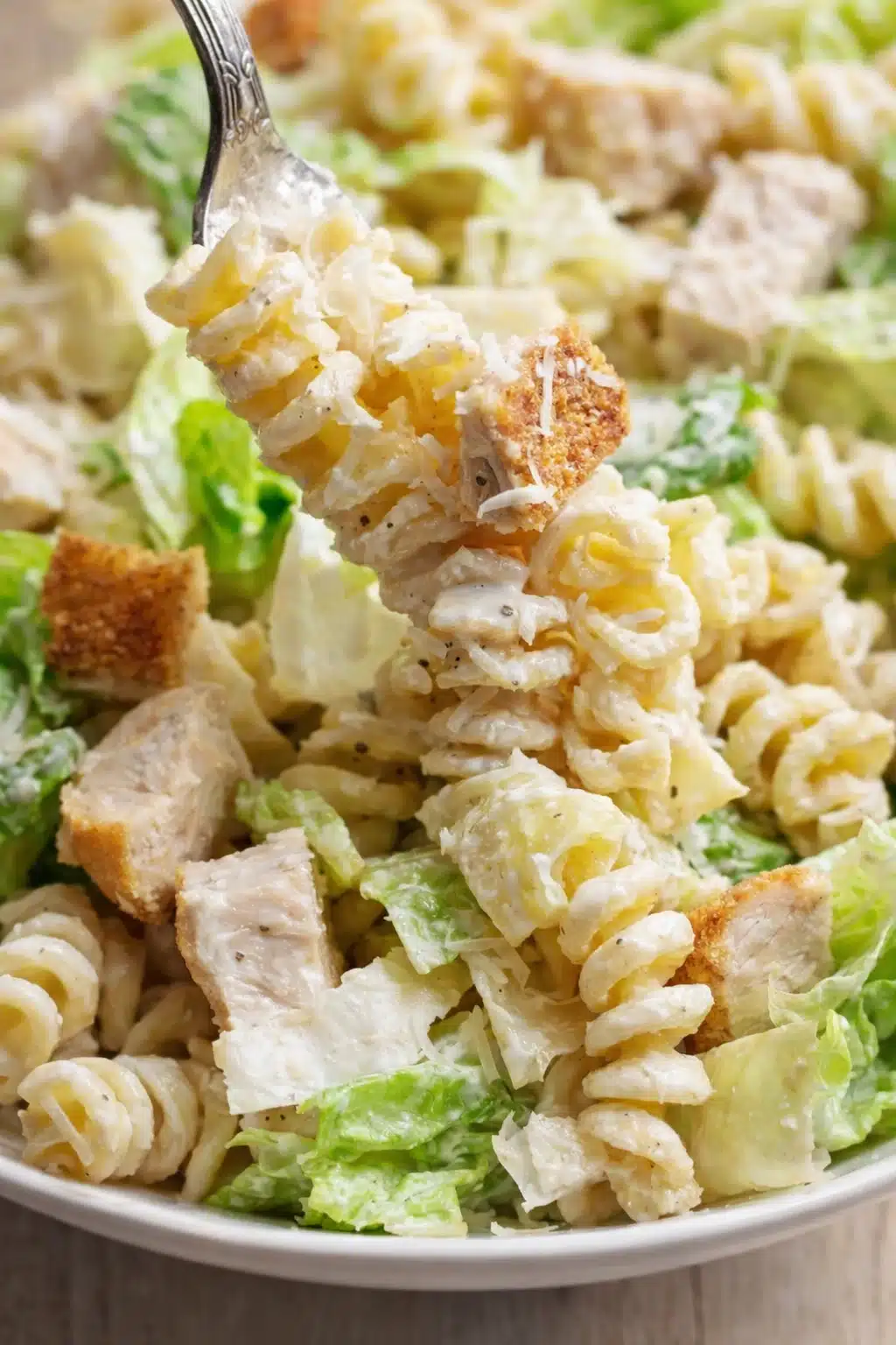 Creamy chicken Caesar pasta salad with rotini, crisp romaine, and golden croutons.