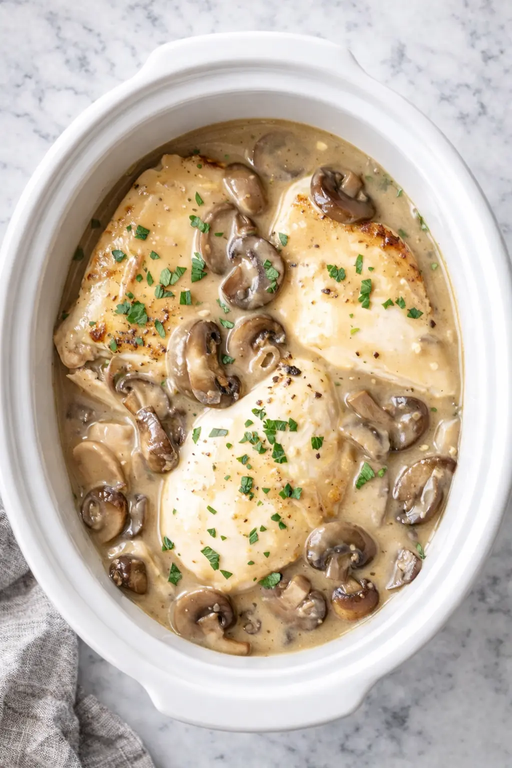 A comforting slow cooker chicken dinner simmered in sweet Marsala wine with mushrooms and garlic — rich, simple, and full of cozy flavor.