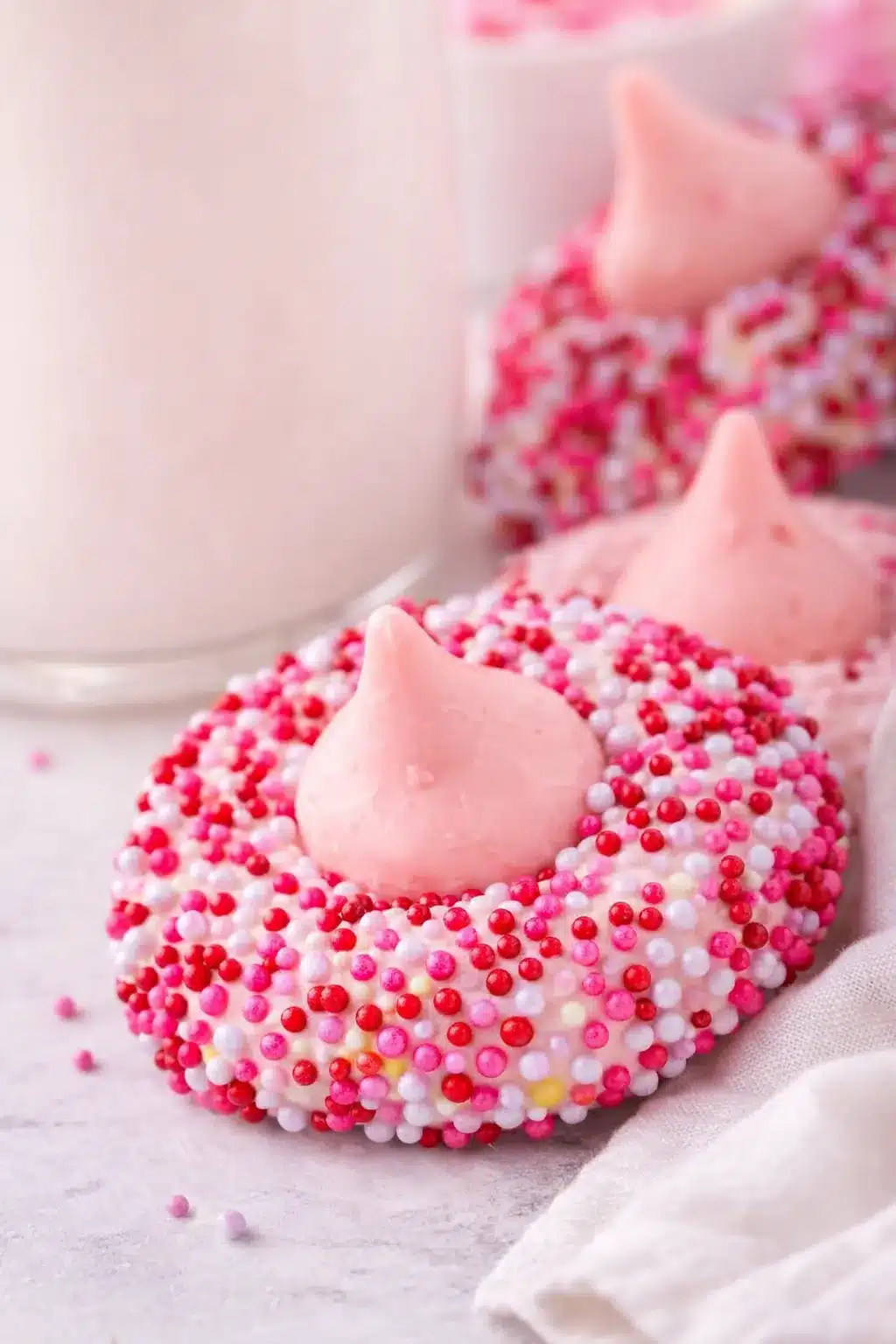 Soft, chewy Strawberry Kiss Cookies made with Funfetti mix, cream cheese, and topped with Hershey’s Strawberry Ice Cream Cone Kisses. Perfect for Valentine’s Day or any sweet occasion.