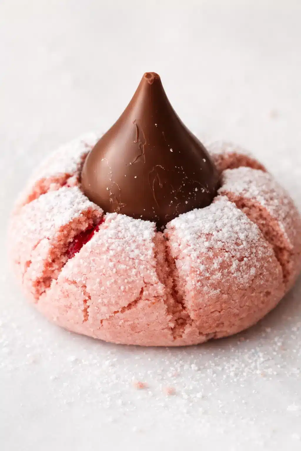 Soft, buttery, pink cookies with a strawberry flavor and smooth chocolate kiss center perfect for Valentine’s Day or gifting.