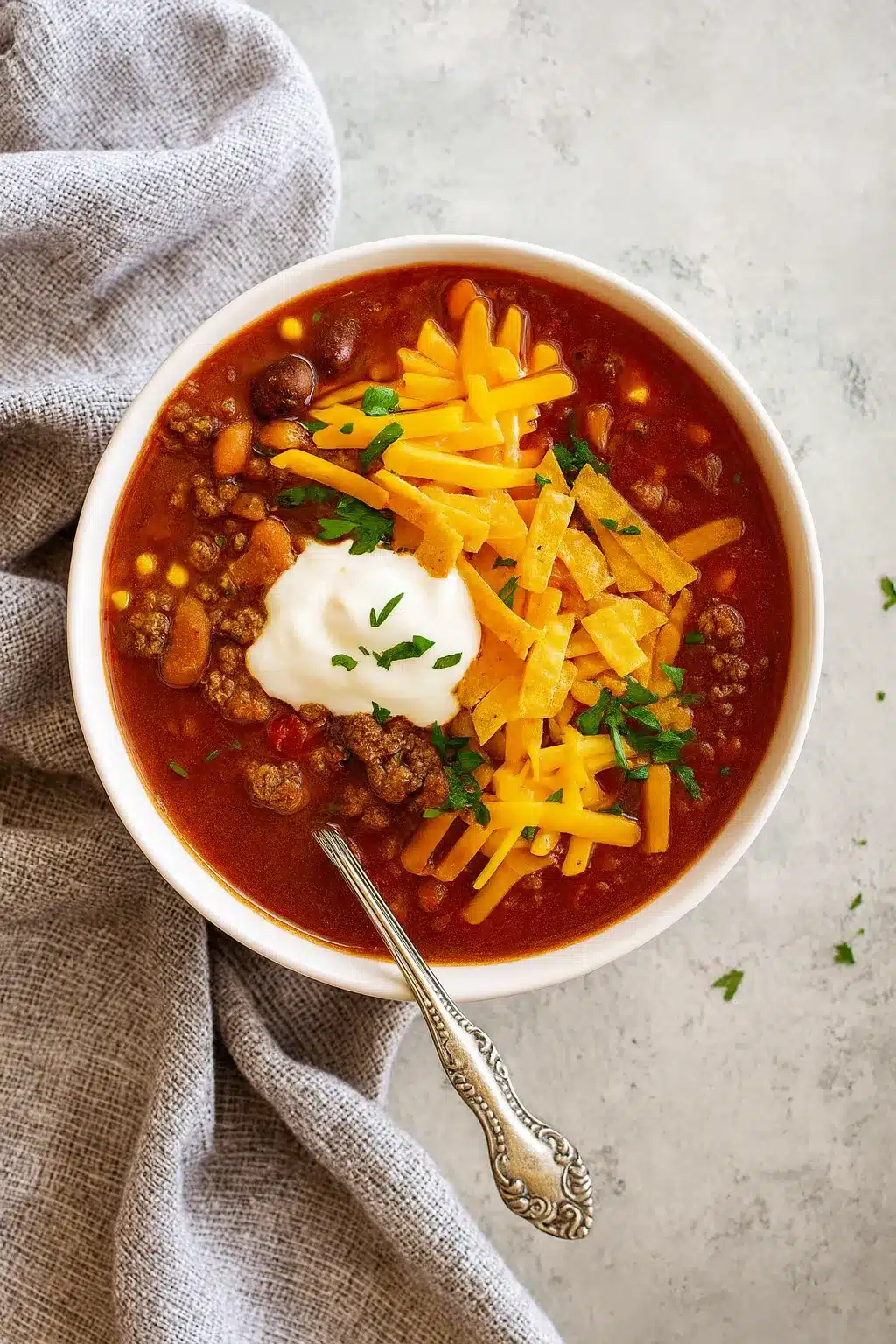 Taco soup loves toppings. Try sour cream, shredded cheddar, avocado slices, chopped onions, fresh cilantro, and crushed tortilla chips. Each adds texture and creaminess.
