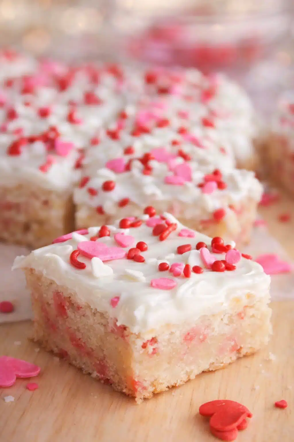 Soft, buttery Valentine sugar cookie bars topped with white frosting and colorful sprinkles. These festive treats are quick to bake, easy to decorate, and perfect for parties or gifting.